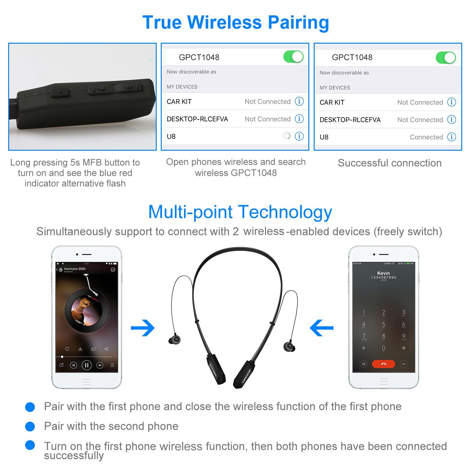 - **User Friendly and Multi-use*: Featured with MFB(Multiple function button) Button and+/-(Volume/Track adjustment) Buttons,simply and quickly fulfill almost all functions like answer/end/redial a phone call,play/pause,pairing,power on/off,etc. Easy operation and brings you much convenience.