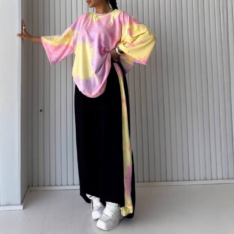 Womens Short-Sleeve Crew-Neck Tie-Dye T-Shirt And Pants Set